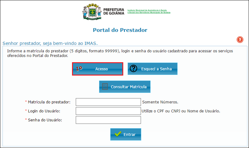 Para realizar o primeiro acesso ao sistema, o operador deverá clicar no botão 1° Acesso, tendo em mãos o CPF/CNPJ do prestador e a matrícula cadastral na operadora. Caso o prestador não saiba sua matrícula, poderá consultá-la no botão Consultar Matrícula.