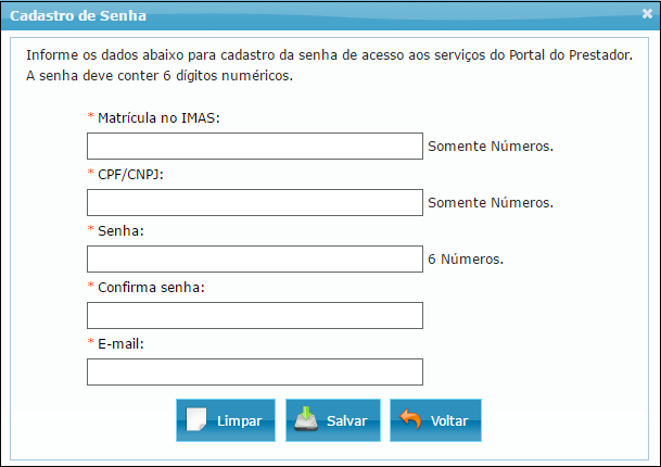 O operador deverá informar os dados solicitados para criar seu usuário no sistema (todos os campos são obrigatórios).