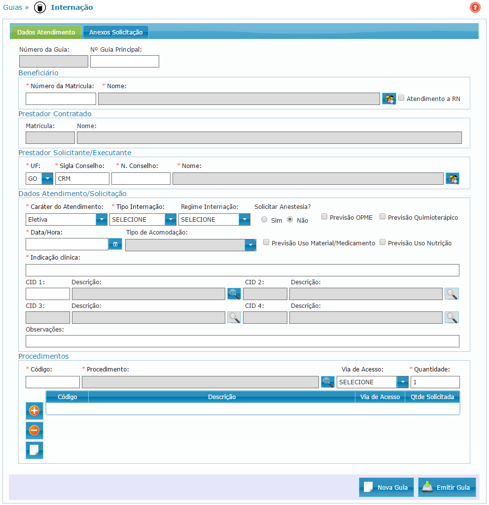 Nela, os dados do prestador contratado são carregados automaticamente. O operador poderá informar dados como beneficiário, prestador solicitante/executante, dados do atendimento/solicitação, procedimentos e observações, caso necessário. Nas guias de internação, é obrigatório anexar o pedido médico, para isto use a aba Anexos Solicitação. Após informar todos os dados obrigatórios, clique no botão Emitir Guia. Caso a guia seja autorizada imediatamente, surgirá uma mensagem na tela informando que o arquivo foi gerado com sucesso, ao clicar em Abrir/Baixar, a guia será exibida em outra aba, onde o operador poderá imprimir ou realizar o download da mesma. Caso a guia não seja autorizada imediatamente, ela poderá ser impressa quando estiver aprovada através do painel de guias.