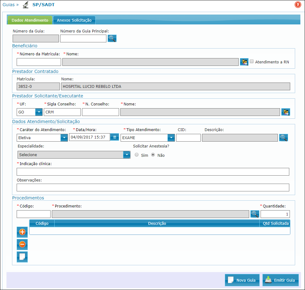 Nela, os dados do prestador contratado são carregados automaticamente. O operador deverá informar dados como número da guia principal (se necessário), beneficiário, prestador solicitante/executante, dados do atendimento/solicitação, procedimentos e observações, caso necessário.