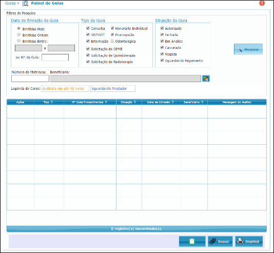 Nela o operador poderá definir os filtros de pesquisa como data de emissão, tipo, situação da guia, entre outros.