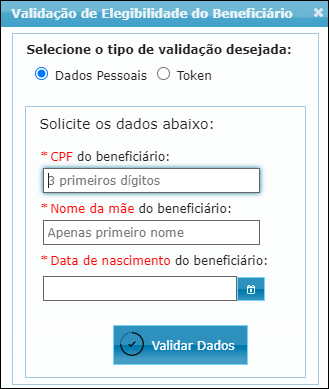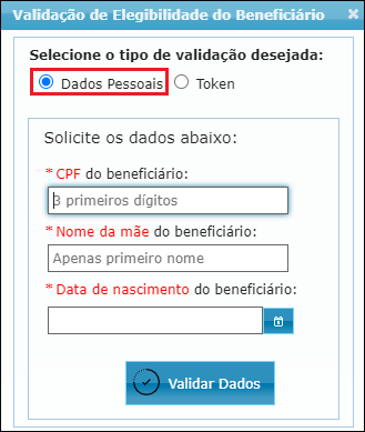 Nesse tipo de validação, são solicitados alguns dados pessoais do beneficiário a ser atendido. Os dados solicitados variam conforme o tipo de beneficiário (titular ou dependente). Para que a validação seja realizada com sucesso, todos os dados solicitados devem ser informados corretamente, conforme cadastrados na base de dados.
