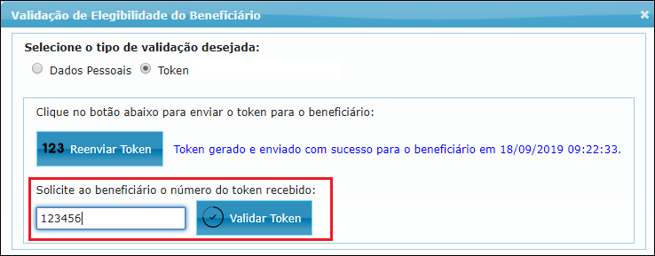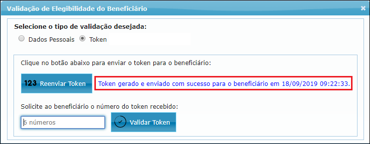 Solicite ao beneficiário o número do token recebido por ele, para que seja possível prosseguir com o atendimento. Caso necessário, é possível reenviar o token a cada 1 minuto.
