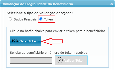 Após o beneficiário informar ao prestador o número do token recebido, o prestador deverá digitá-lo na tela e clicar no botão Validar Token.